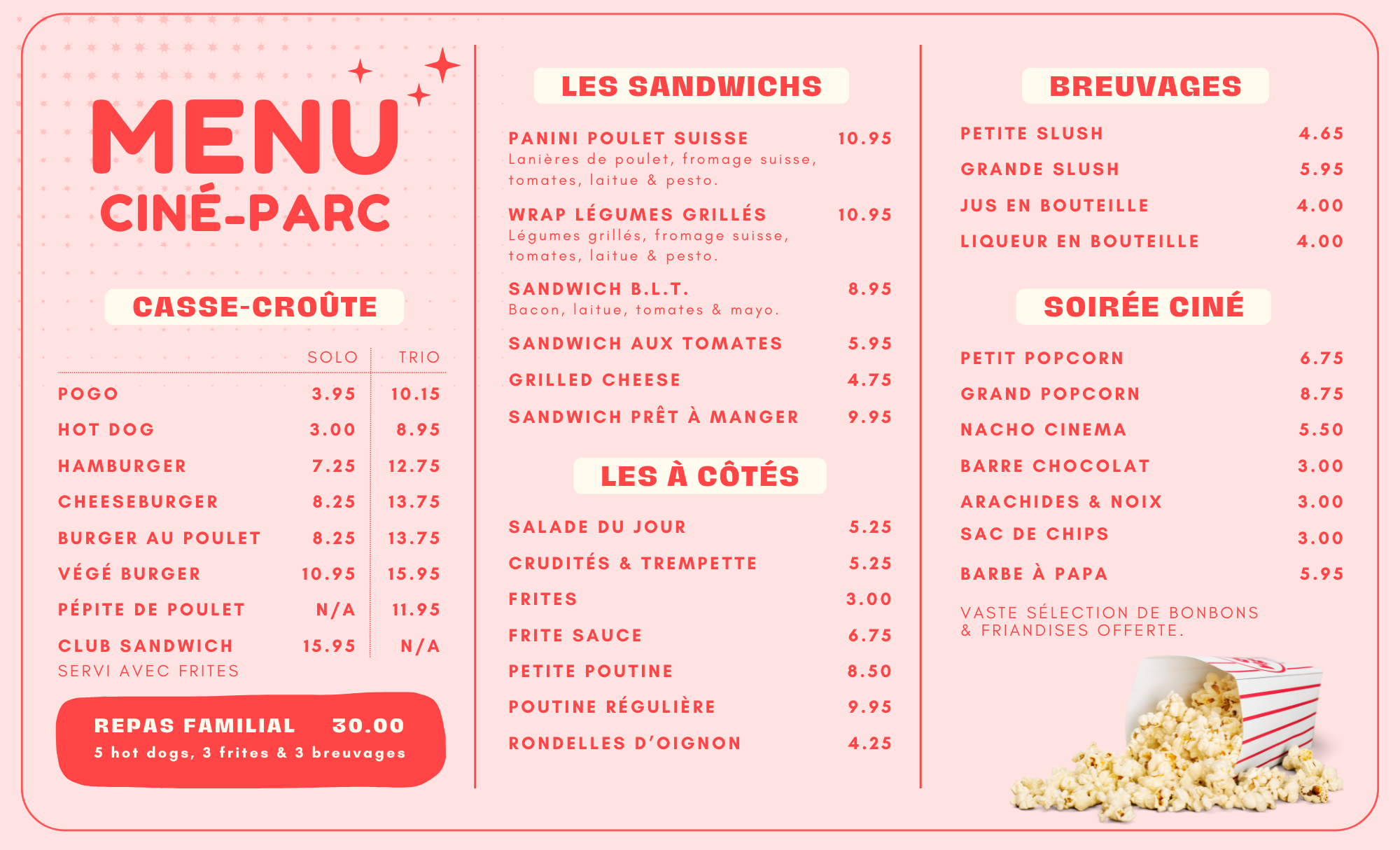 Le casse-croûte ferme lorsque le deuxième film débute. Toutefois, les toilettes demeurent accessibles jusqu'à la fin des dernières représentations.